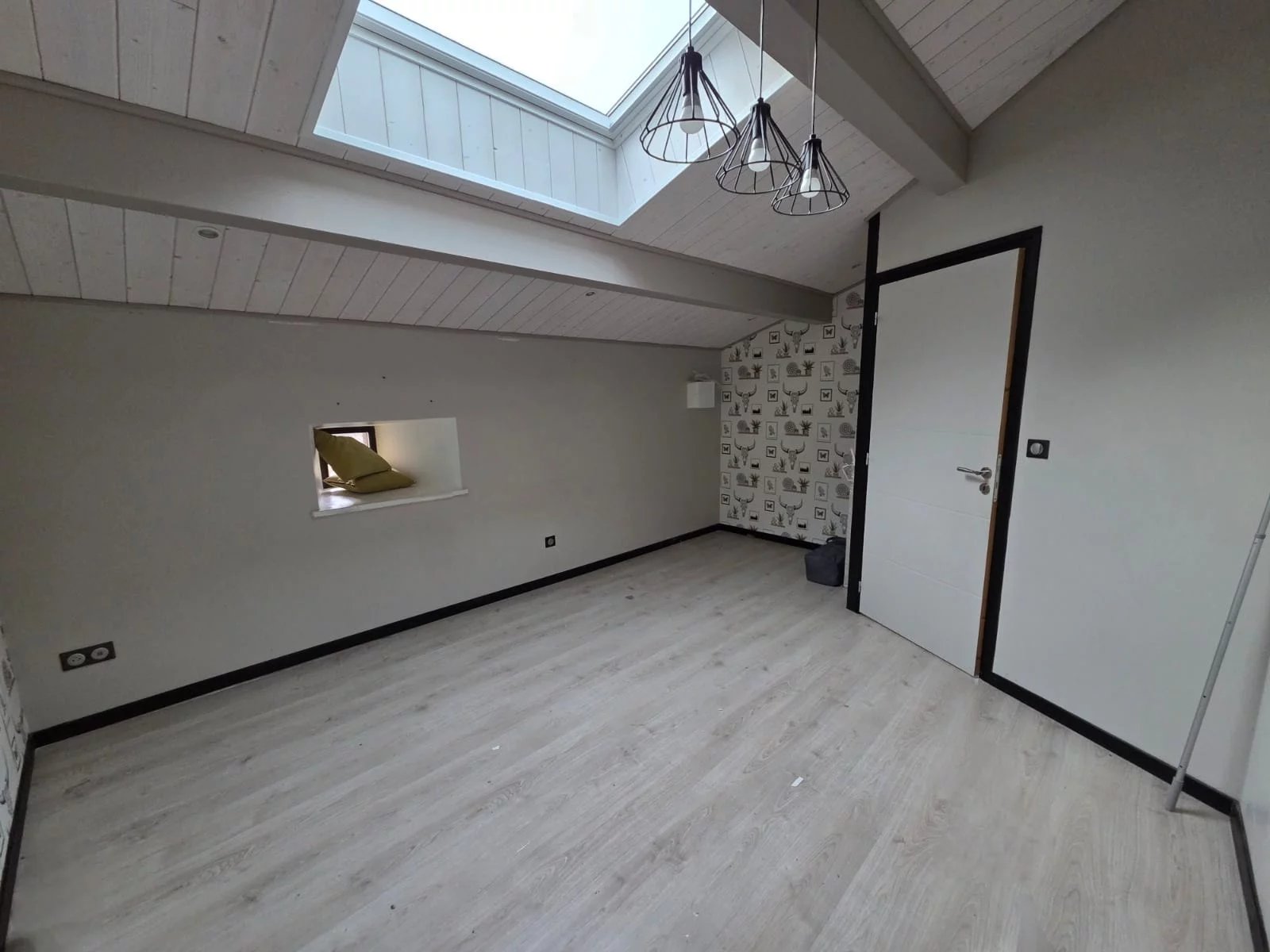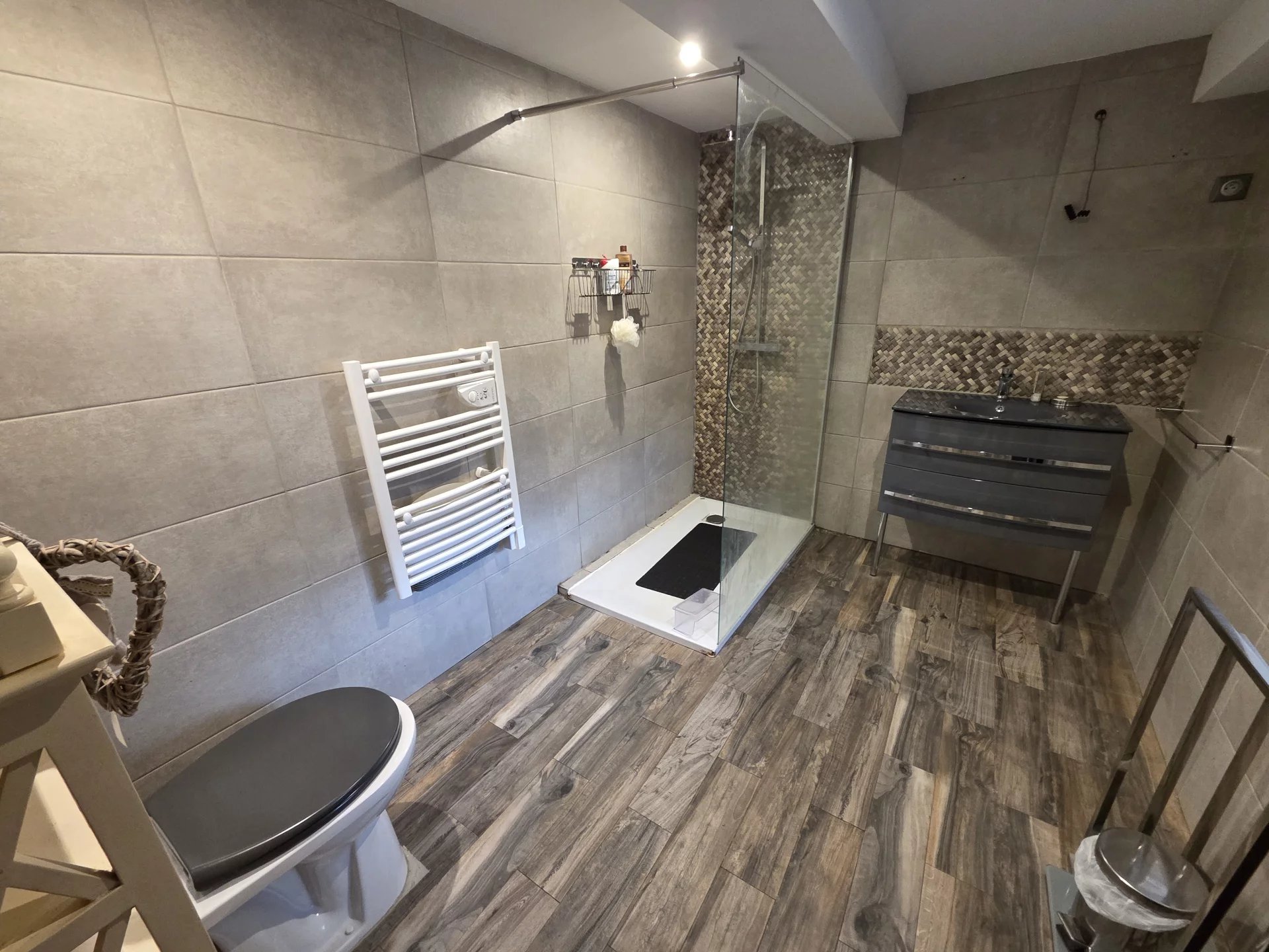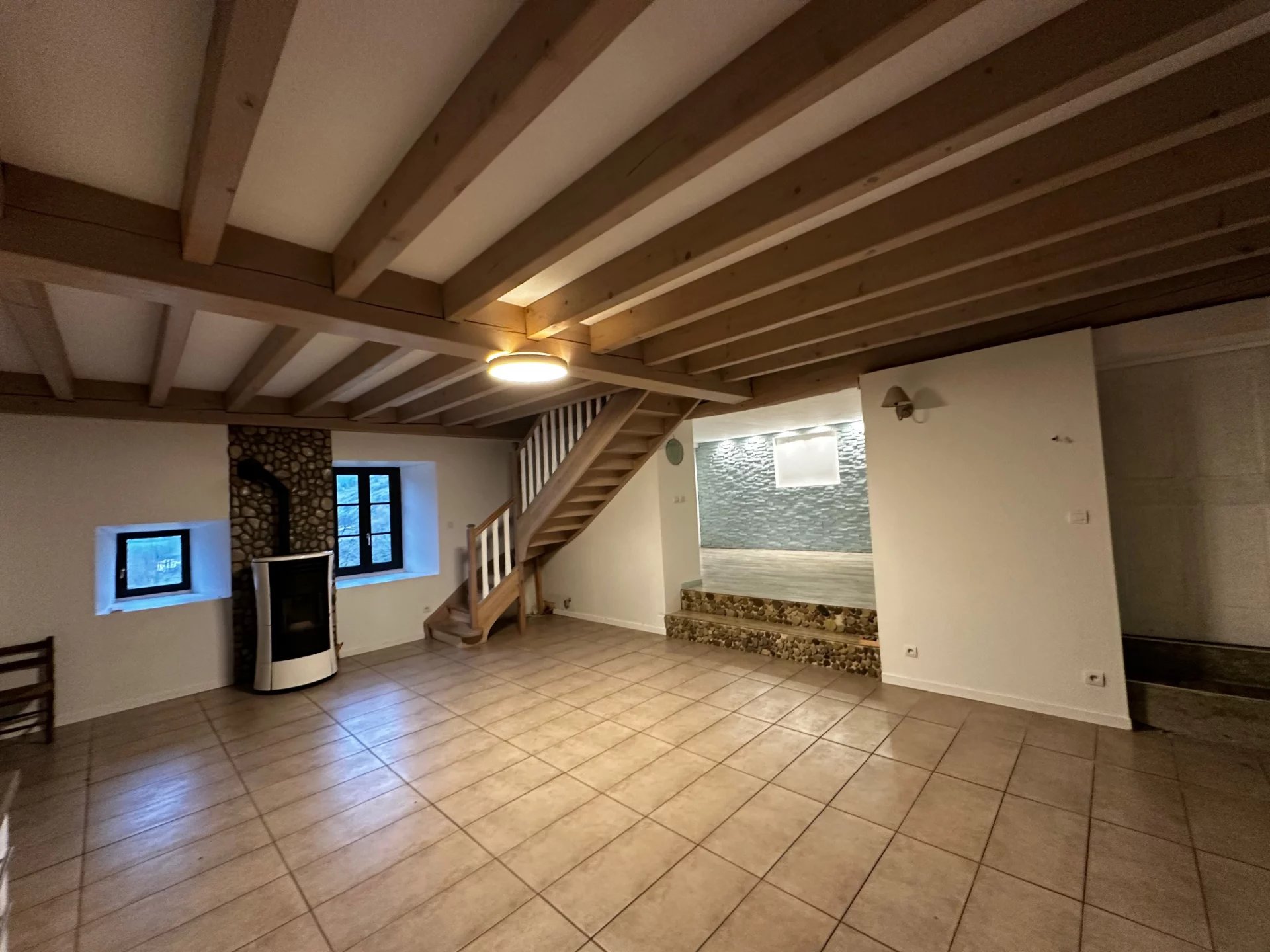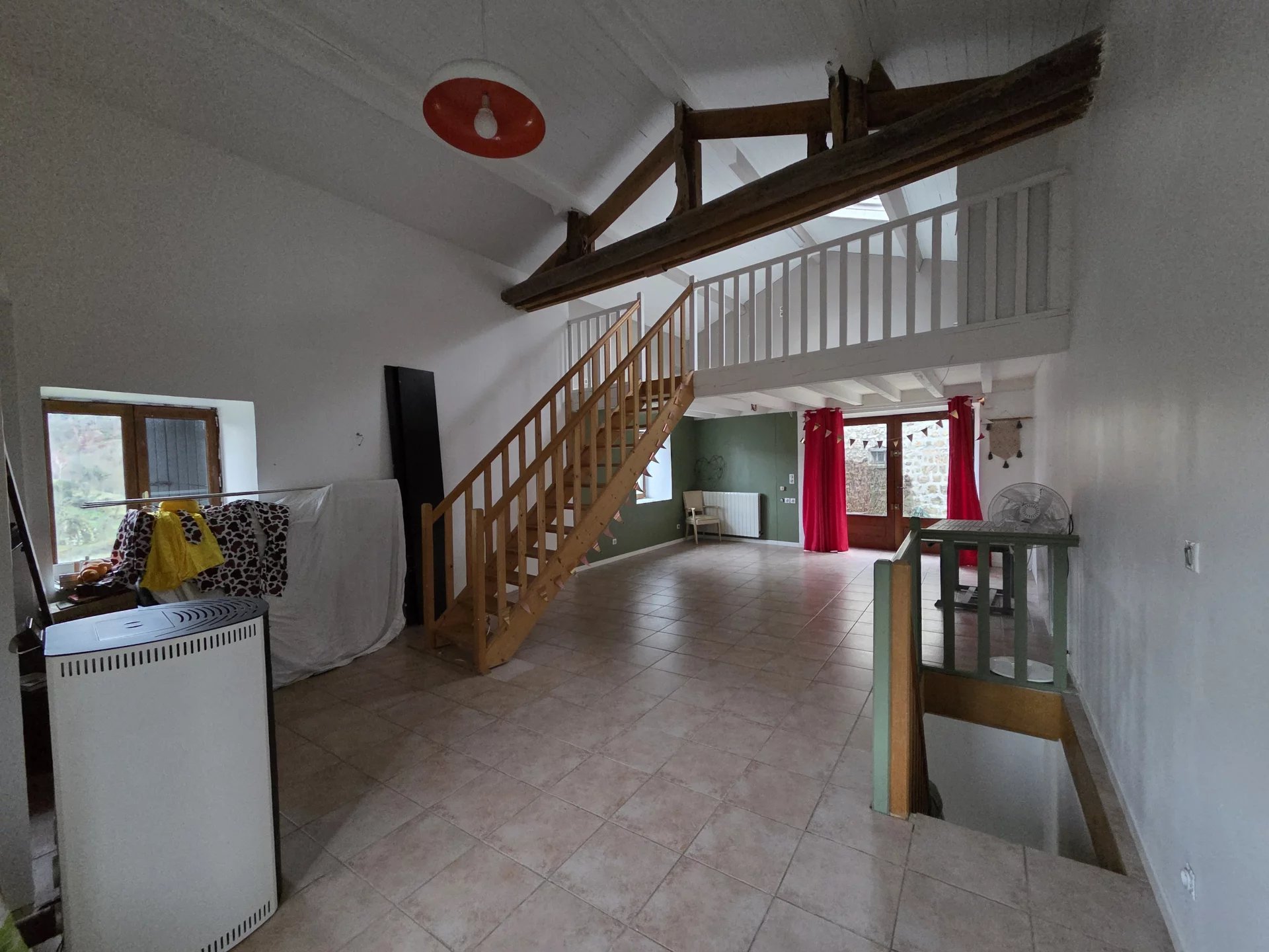 À l’étage : une grande pièce de vie de 40m² équipée d’un poêle à granulés, une mezzanine.