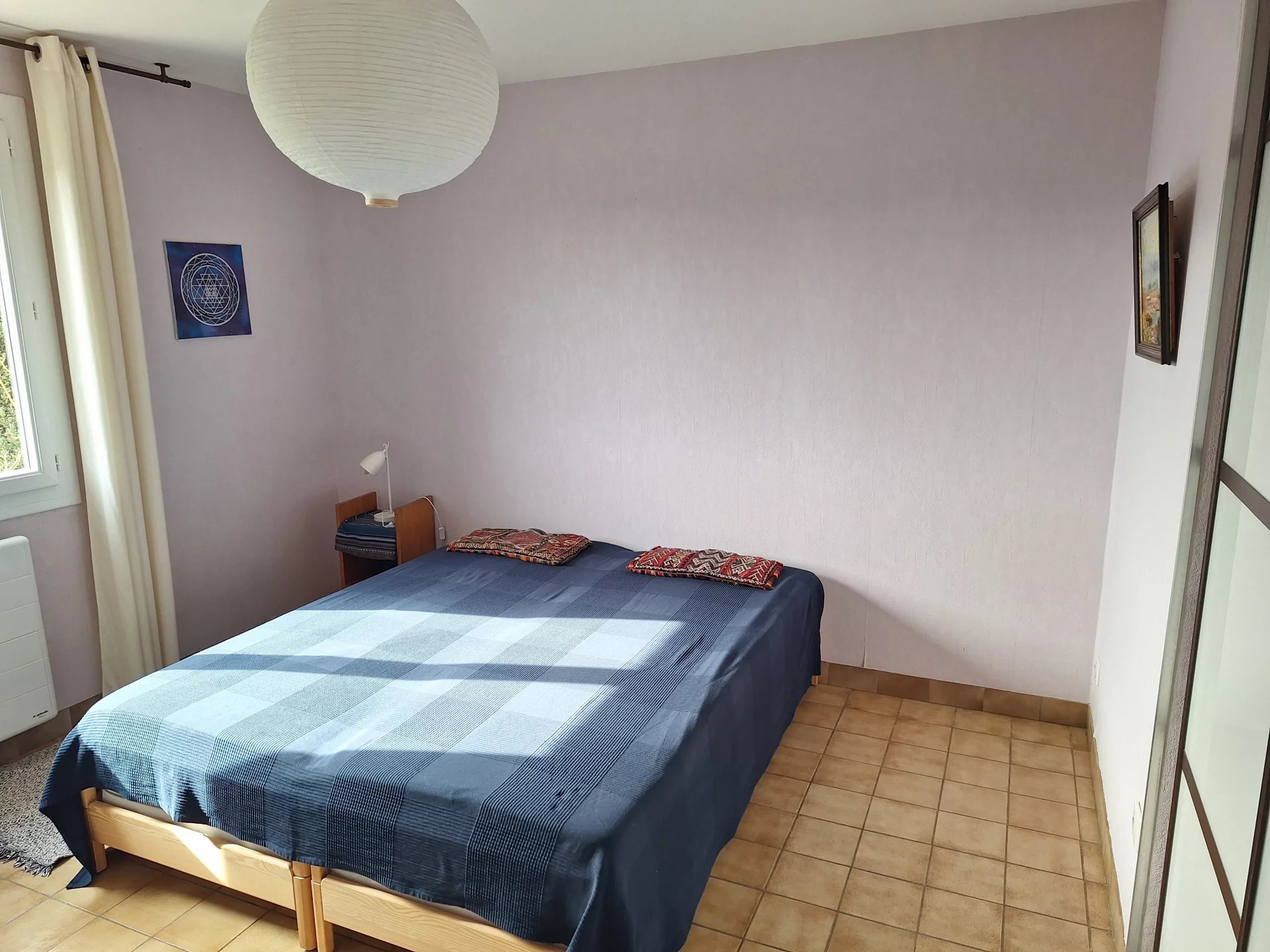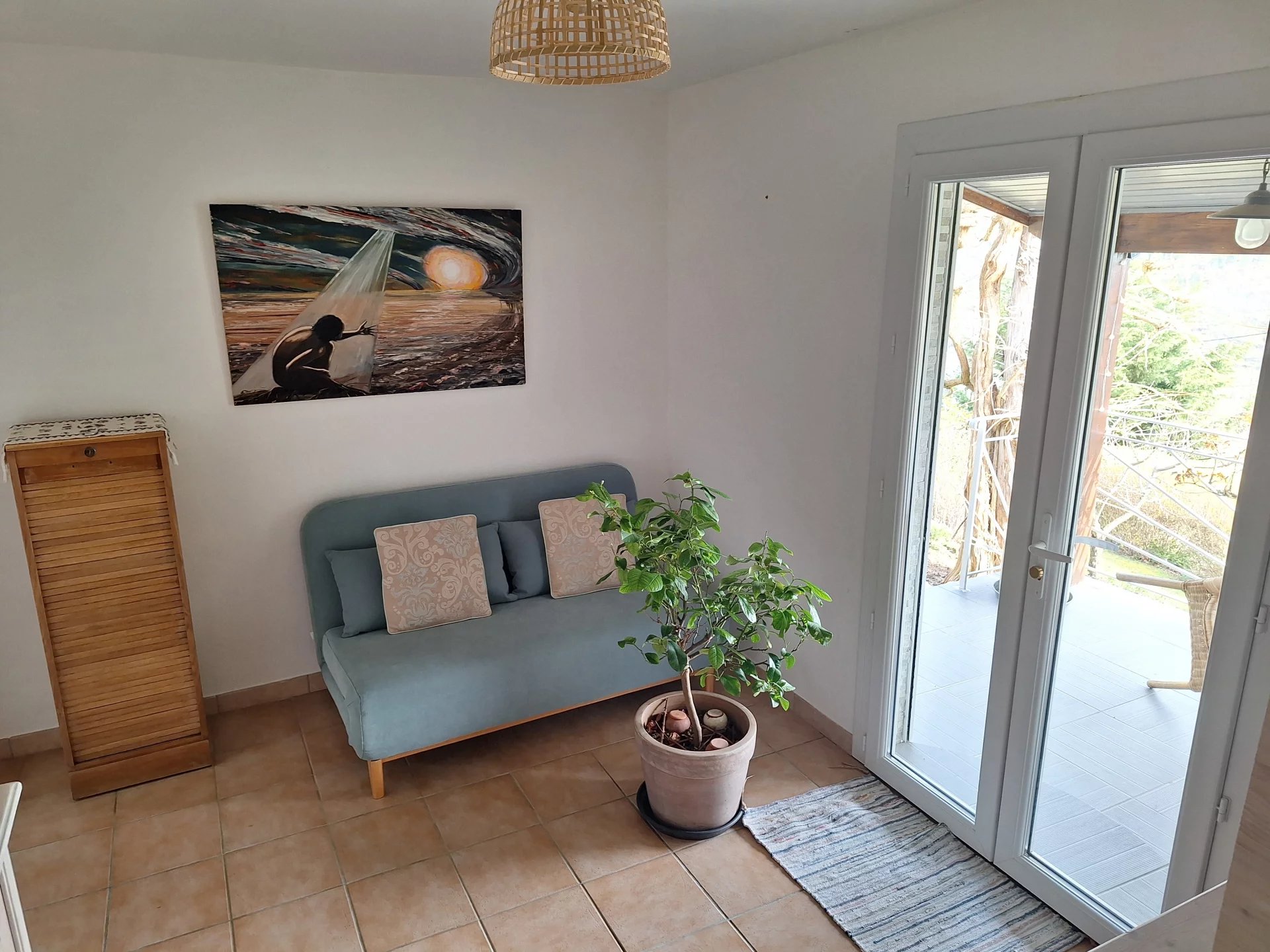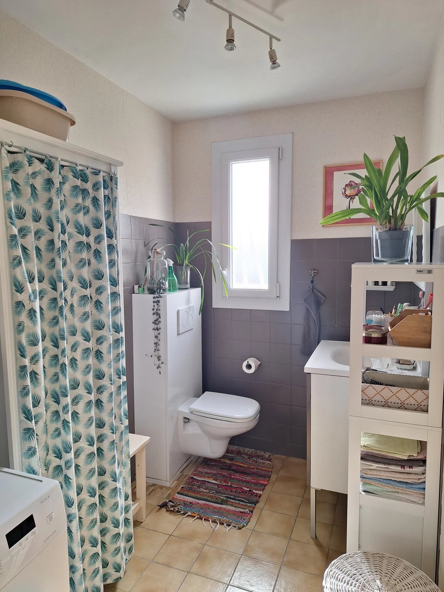 Elle propose 83 m² habitables comprenant : une entrée avec rangements, une cuisine ouverte sur une agréable pièce de vie équipée d’un poêle à bois, des toilettes, deux chambres, un cellier, une salle d’eau, ainsi qu’un coin bureau avec accès direct à la terrasse.